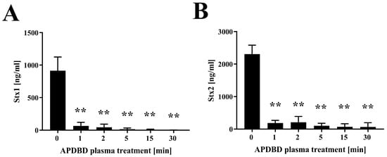 Quantitative measurement of Shiga toxins (Stx1 and Stx2) by ELISA after APDBD treatment. Samples of Stx1 (A) and Stx2 (B) were treated with APDBD plasma for 0, 1, 2, 5, 15, and 30 min. Recovered samples after plasma treatment were subjected to an immunoassay using a RIDASCREEN® Verotoxin kit (R-Biopharm AG, Darmstadt, Germany) to determine the concentrations of Stx1 and Stx2. Values were considered significantly different from the untreated sample (0 min) when verified by a non-repeated measures ANOVA, followed by a Tukey test (** p < 0.01).