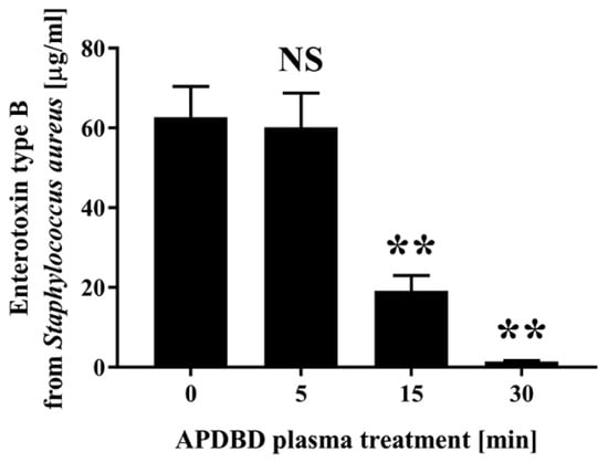 Dried spots of enterotoxin type B derived from Staphylococcus aureus were subjected to APDBD treatment for 0, 5, 15, and 30 min using a roller conveyer plasma instrument. The amount of enterotoxin type B in the recovered samples was subsequently determined by ELISA. Values were considered significantly different from the untreated sample (0 min) when verified by a non-repeated measures ANOVA, followed by a Tukey test (** p < 0.01). NS: not significantly different from the untreated sample (0 min).