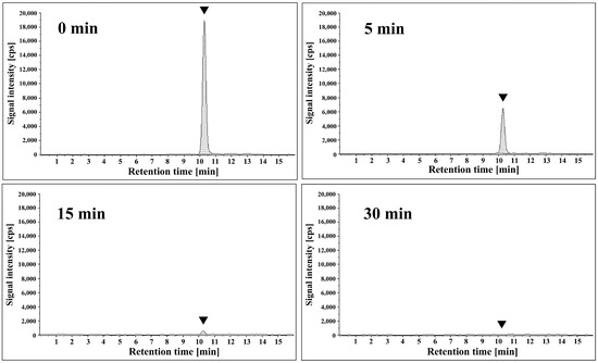 Cereulide derived from Bacillus cereus was subjected to treatment with APDBD plasma for 0, 5, 15, and 30 min using a roller conveyer plasma device. The recovered samples were analyzed by liquid chromatography–tandem mass spectrometry. Representative chromatograms are shown. Peaks corresponding to cereulide (assigned to m/z 1171→357) are indicated (▼). X-axis, retention time (min); Y-axis, signal intensity; cps, counts per second.