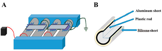 Schematic representation of the atmospheric-pressure dielectric-barrier discharge (APDBD) plasma treatment of bacterial toxins. (A) Toxins were applied to an aluminum plate and subjected to APDBD treatment using a roller conveyer plasma device consisting of high-voltage electrodes and earth electrodes. (B) Both electrodes comprise a plastic rod (30 mm diameter) covered with an aluminum sheet (0.02 mm thick) and a silicone sheet (0.5 mm thick). A high-voltage power supply (10 kHz, 10 kV (Vpeak-to-peak)) was used to generate the APDBD plasma. Modified from Figure 6 in Sakudo and Yagyu [38], published under an open access Creative Commons CC BY 4.0 license.