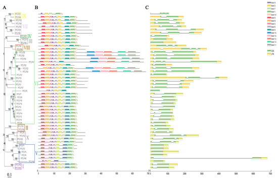 Phylogenetic tree, protein motif, and gene structure of 49 PtTLPs genes. (A) Phylogenetic tree. Branch lengths represent genetic distances, and the scale bar represents 0.1. We labeled cluster I–X and marked them with boxes of different colors. (B) Protein motifs. Conserved motifs 1–15 are represented by colored boxes, while non-conserved sequences are indicated by gray lines. (C) Gene structure. Yellow boxes represent exons, black lines represent introns, and untranslated regions (UTRs) are showed by green boxes. The sizes of the exons and introns can be estimated by the scale at the bottom.