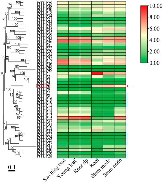 Hierarchical clustering of expression profiles of PtTLP genes in different tissues. The microarray data were downloaded from the JGI Data Portal (https://phytozome-next.jgi.doe.gov/geneatlas/; accessed on 10 October 2023) []. The color scale at the right of the graph indicates log2 expression values. PtTLP6 was marked with a red box and a red arrow. Branch lengths of the phylogenetic tree represent genetic distances, and the scale bar represents 0.1.