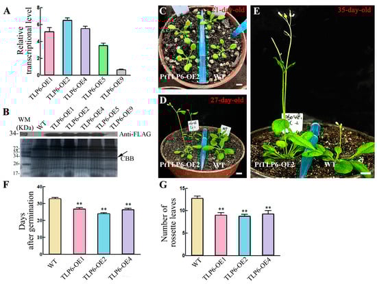 Next, we planted PtTLP6-OE1, 2, 4, and wild type (WT) in the greenhouse to observe their phenotypes. It showed that the phenotype of the overexpression lines was similar to that of the WT at the seedling stage (Figure S5). At 21 days, there was no difference in the phenotypes, the number of rosette leaves, and the leaf size, between the overexpression lines and the WT (Figure 5C). The PtTLP6-OE lines flowered at 27 days, while the WT had not bolted yet (Figure 5D). By 35 days, the WT had bolted, while the overexpression lines had already developed the siliques (Figure 5E). We counted the days after germination to flowering and the number of rosette leaves of flowering PtTLP6-OE lines and WT plants (Figure 5F,G). After approximately 32 days of growth on soil, WT plants flowered, while PtTLP6-OE lines did at 25–27 days. When flowering, there were 12–13 rosettes in WT and 8-10 in PtTLP6-OE lines. The findings indicate that overexpression of PtTLP6 gene in Arabidopsis leads to early flowering, possibly by accelerating the growth process of transgenic plants.