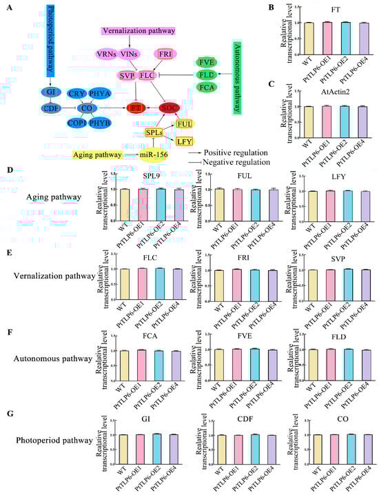 To examine whether early flowering results from the expression changes of flowering marker genes, we collected the sixth rosette leaves of WT and PtTLP6-OE lines to conduct RT-qPCR analysis of FLOWERING LOCUS T (FT), a key gene regulating the flowering time and flowering regulatory genes in various pathways [,]. The results showed that the transcription levels of FT were nearly unchanged between the WT and PtTLP6-OE lines (Figure 6B). In the aging pathway, the expression levels of SPL9, FUL, and LFY showed no significant variation among WT and PtTLP6-OE lines (Figure 6D). In the vernalization pathway, the transcription levels of the FLC, SVP, and FRI were not significantly altered among the WT and PtTLP6-OE lines (Figure 6E). The expression levels of FVE, FLD, and FCA in the autonomous pathway were not significantly changed among the WT and PtTLP6-OE lines (Figure 6F). Similarly, the transcription levels of GI, CDF, and CO from the photoperiod pathway almost stayed in line among the WT and PtTLP6-OE lines (Figure 6G). Overall, the transcription levels of these flowering regulatory genes tested remained largely unchanged between the WT and PtTLP6-OE transgenic lines.