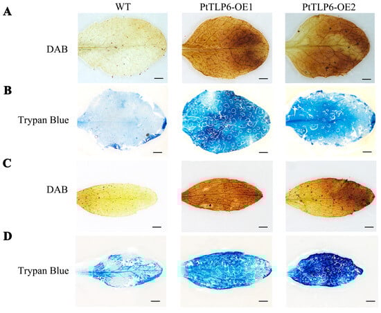 Cell viability staining of the rosette and cauline leaves of WT and PtTLP6-OE lines. (A,C) DAB staining of the rosette and cauline leaves from WT and PtTLP6-OE lines. (B,D) Trypan blue staining of the rosette and cauline leaves from WT and PtTLP6-OE lines. The scale bars are 100 µm.