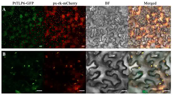 The transient transformation of tobacco mesophyll cells was performed in a previous study []; the A. tumefaciens strains with 35S::PtTLP6-GFP vector, mt-rk-mCherry control vector containing the first 29 aa of yeast cytochrome c oxidase IV (ScCOX4) for mitochondria localization, and px-rk-mCherry control vector containing peroxisomal targeting signal 1 (PTS1) for peroxisome localization [,,] were all incubated overnight in 20 mL YEP liquid medium supplemented with 50 µg mL−1 kanamycin, gentamicin, and rifampicin at 200rpm at 28 °C, until the OD600 value reached 0.8. Then, 2 mL of the bacterial cultures was inoculated into 50 mL YEP liquid medium supplemented with 50 µg mL−1 kanamycin, gentamicin, and rifampicin at 200 rpm at 28 °C, until the OD600 value reached 0.5. Cell pellet was collected by centrifugation at 3000× g for 5 min and suspended in 50 mL transformation medium (containing 100 mM Mgcl2, 300 mM AS, 100 mM MES) for transient transformation. The transformation medium was then infiltrated into the air spaces of mesophyll cells of Nicotiana benthamiana leaves (also known as “agroinfiltration”), in which they transform plant cells, which in turn express the transgene within 48 h of dark culture.