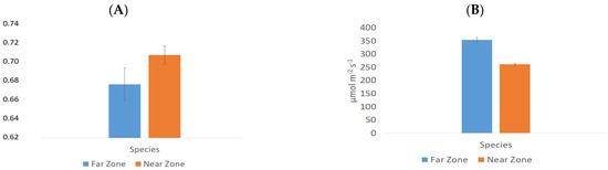 Photosynthetic physiology of the Near and Far Zone species of B. macraei (A) In situ photosynthetic capacity (Yield II). (B) In situ electron transport rate (ETR in situ, expressed in mmol electrons m−2 s−1). All the values showed significant differences with a p < 0.05. Irradiance in situ for the Near and Far Zones were 782 and 1108 µmol photons m−2 s−1, respectively.