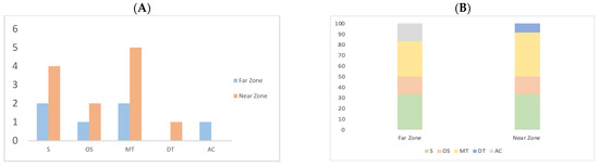 According to Figure 3A, the number of compounds per chemical class in the Near Zone sample demonstrates an increased diversity of sesquiterpenes and monoterpenes compared to the Far Zone. In addition, in Figure 3B, the total area occupied by sesquiterpenes, oxygenated sesquiterpenes, monoterpenes, diterpenes, and aromatic compounds accounts for 33.33%, 16.67%, 33.33%, 0.00%, and 16.7% in the Far Zone, respectively. In contrast, in the Near Zone sample, these percentages are 33.33%, 16.67%, 41.67%, 8.33%, and 0.00%, respectively.