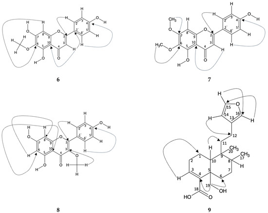 Mixture of Hispidulin (6) and Cirsimaritine (7): The presence of two compounds in fraction 13 of the ethyl acetate extract from B. macraei in the Far Zone was determined from 1H NMR, where the characteristic peaks of the aromatic B ring of a flavonoid (δH 7.91 and 6.94 for the compound cirsimaritine and δH 7.87 and 694 for hispidulin) can be seen. It also shows the presence of three methoxyl groups, one for hispidulin [37] and two for cirsimaritine, which are found at δH 3.88, 3.99, and 3.84, respectively. From this, HSQC analysis confirms the correlation of each hydrogen with the carbon to which it is bonded [38]. In the HMBC assay, the following heteronuclear interactions are observed, in which the correlation of δH 7.91 (H-2′) with δC 115 (C-3′), 162 (C-4′), and 165 (C-2), which have bond distances of two, three, and three bonds, respectively, with respect to H-2′ (, , and ). In addition, the displacement of δH 6.93 (H-3′) with δC 122 (C-1′) is observed three links away (). As for rings A and C, the classification is established mainly from H-3, where δH 6.84 correlates with δC 183 (C-4), 159 (C-9), and 105 (C-10). The link distances to which they are found, with respect to H-3 is, two, four, and three, respectively (, and ). Finally, the carbons of ring A were related to H-OMe of carbon 6 and 7, observing the following displacements: δH 3.84 (H-6-OMe) with δC 150 (C-5) and 132 (C-6), and δH 3.99 (H-7-OMe) with δC 159 (C-7), which are found at four, three, and three bonds (, , and ). Figure 4 shows the correlations described.