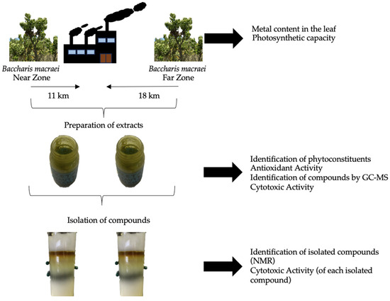 Figure 5 presents the experimental design carried out for this study. B. macraei specimens were collected at two different distances from the “Las Ventanas” industrial complex located in the industrial zone of Quintero-Puchuncaví. The metals present and the photosynthetic capacity of the plants were measured from the B. macraei leaf as well as from the rhizosphere (the soil that surrounds plant roots in this study). An extract was prepared using ethyl acetate and the content of phytoconstituents and antioxidant and cytotoxic activity, as well as volatile and semi-volatile compounds, were identified. Compounds that were identified were isolated from the extracts, and the cytotoxic capacity of each isolated compound was evaluated individually in tumorigenic and non-tumorigenic cell lines.