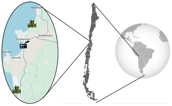 The Puchuncaví Valley, an agricultural area located 35 km north of the city of Valparaíso (V Region of Chile), has been persistently impacted for the last five decades by atmospheric pollutants and the atmospheric deposition of particles rich in metals from the various activities within a “Las Ventanas” industrial complex that includes coal-fired power plants, a copper refinery and smelter, natural gas terminals, cement companies, and other types of industries [21,22,23]. The effects of these depositions with historical trace elements remain latent in the soil of this area despite current environmental regulations. The background concentrations of Cu, As, Pb, and Zn are close to 100, 16, 35, and 122 mg/kg, respectively [24,25]. In particular, the areas of La Greda and Los Maitenes present greater soil contamination due to their proximity to the industrial complex and the predominant southwesterly winds [21,26].