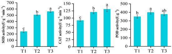 Physiological indexes of potato leaves’ SOD, CAT, and POD activities were determined under oxidative stress. The values are means ± SD of three replicates (p < 0.05). The a, b, and c represent significant differences.