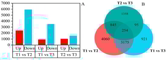Differentially expressed genes (DEGs) analysis. (A) The number of up- and down-regulated DEGs among T1 vs. T2, T1 vs. T3, and T2 vs. T3 comparisons. (B) Venn diagram comparison of the number of DEGs.