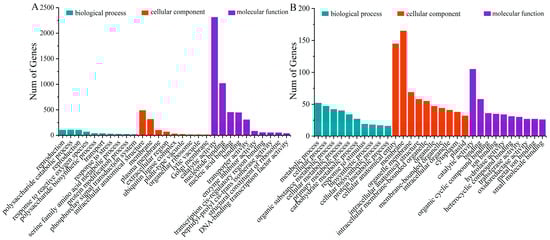 GO classification analysis of DEGs in (A) T1 vs. T2 and (B) T1 vs. T3.