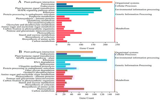 KEGG is primarily used to predict the functions of expressed genes. To gain a deeper understanding of the functions of DEGs, a KEGG enrichment analysis was performed on them. The top 20 results of the enriched entries revealed that the DEGs under the two stress treatments were primarily associated with the “plant–pathogen interaction”, “MAPK-signaling pathway-plant”, “ribosome”, and “plant hormone signal transduction”. The most significant enrichment was observed in the metabolic pathway, which also encompassed “photosynthesis” and the synthesis of secondary metabolites (Figure 4). These pathways are associated with plant responses to abiotic stresses, and mitogen-activated protein kinase (MAPK) plays an important role in regulating plant growth and stress tolerance. It is also a significant regulator of the plant antioxidant system in response to various stimuli. The plant hormone signaling pathway is crucial for responding to stress and throughout the growth and development of a plant. At different stages of plant growth, a variety of plant hormones act synergistically or antagonistically to guide the normal growth of plants, including adaptation to the environment and resistance to stress.