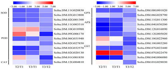 Heatmaps of EDGs encoding genes about SOD, POD, CAT, GPX, APX, and GST. Each column represents the mean expression value (log2 FPKM, T2 sample is divided by T1 and T3 sample is divided by T1 and T2, respectively) of three biological replicates obtained from RNA-Seq data.