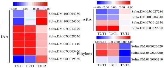 Heatmaps of EDGs involved in plant hormone signaling, including IAA, ethelene, and ABA. Each column represents the mean expression value (log2 FPKM, T2 sample is divided by T1, T3 sample is divided by T1 and T2, respectively) of three biological replicates obtained from RNA-Seq data.