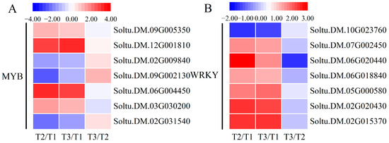 Heatmaps of DEGs encoding transcription factors. (A) The transcription factor of MYB. (B) The transcription factor of WRKY. Each column represents the mean expression value (log2 FPKM, T2 sample is divided by T1, T3 sample is divided by T1 and T2, respectively) of three biological replicates obtained from RNA-Seq data.