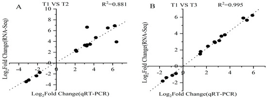 Verification of RNA-Seq results with qRT-qPCR in (A) T1 vs. T2 and (B) T1 vs. T3.