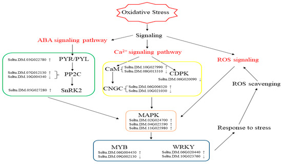 In addition, the plant’s own antioxidant defenses during oxidative stress are also regulated by a number of protein kinases and transcription factors [33]. Protein kinases, such as MAPK, are key regulators that modulate the antioxidant defenses and response to stress [34,35]. Oxidative stress induces phosphorylation of MAPK by H2O2, which then participates in a signaling cascade that regulates the expression of downstream genes [36]. In this study, there were three DEGs of MAPK, and all of them were up-regulated (Table 2), suggesting that oxidative stress induces a phosphorylation cascade in MAPK. The phosphorylation cascade in plants regulates gene expression by modulating the activity of transcription factors, which ultimately improves plant adaptation to stress [37]. Studies have shown that activated MAPK6 in Arabidopsis interacts with MYB transcription factors to improve plant salt tolerance [38]. MYB and WRKY, as two types of transcription factors with numerous families in plants, are involved in regulating multiple signaling pathways. XsWRKY20 in Xanthoceras sorbifolium positively regulates drought stress tolerance by integrating ROS homeostasis and ABA signaling pathways to regulate antioxidant enzyme-related genes [39]. However, overexpression of CbWRKY27 in Catalpa bungei, integrating the ABA and ROS pathway, resulted in plant sensitivity to ABA, decreased antioxidant enzyme activity, and increased H2O2 content negatively regulates salt tolerance [40]. Arabidopsis AtMYB30 can participate in signaling and the regulation of salt, heat, and oxidative stress with ROS and calcium signaling pathways [41]. These findings suggest that the role of transcription factors in the downstream regulation of ROS is complex. In this study, we focused on analyzing some MYB and WRKY transcription factors in potato plants under oxidative stress. Most of the transcription factors showed up-regulated expression, of these, Soltu.DM.06G004450 and Soltu.DM.06G020440 had the highest expression. This indicates that these two transcription factors may positively regulate tolerance to oxidative stress in potato plants.