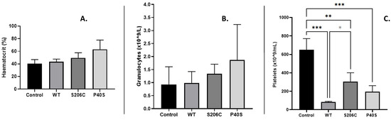 Blood biometry after challenge injection. (A) Haematocrit percentage, (B) granulocyte concentration and (C) platelet count for all experimental groups. Standard deviations are shown by vertical bars, n = 3, *: p-value < 0.05 (WT—S206C), **: p-value < 0.005, ***: p-value < 0.0005. No statistically significant differences were observed in haematocrit percentage or granulocytes comparing the groups.