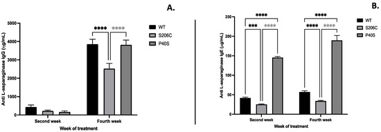 Rathod et al. (2019) reported that ASNase binds mainly to basophils and B cells and to a lesser extent to neutrophils and macrophages, following two sensitisation doses of 10 mg of E. coli ASNase and a challenge dose of 100 mg on day 24 in 8-week-old female C57BL/6 mice [24]. This scheme of treatment was used to induce humoral hypersensitivity through immune complex sensitisation and a re-exposure to the antigen with a challenge dose, similar to our assay. The authors also found that ASNase binding to immune cells could occur either freely (cell-associated IgE) or through anti-ASNase IgG and IgE immune complexes, mainly to basophils, which express both high-affinity IgE receptor FcεRI and low-affinity IgG receptor FcγRIII. Thus, our results indicate that anti-ASNase IgG-mediated hypersensitivity after the challenge dose was significantly higher in WT- and P40S-enzyme-treated groups on the fourth week, unlike the S206C enzyme, which induces the lowest titre of both anti-ASNase IgG and IgE throughout the experiment. Indeed, IgE concentration in mice in WT- and S206C-enzyme-treated groups slightly increased from the second to the fourth week, unlike P40S-exposed animals, which effectively produced a high and increasing titre of anti-ASNase IgE in both measurements.