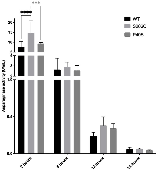 Asparaginase activity measured in mice plasma after 2, 6, 12 and 24 h of a single dose injection of 1050 U/Kg of each ASNase—WT and mutants—and quantified by oxine method. Standard deviation is shown by a vertical bar, n = 5, ***: p-value < 0.0005, ****: p-value < 0.00005.