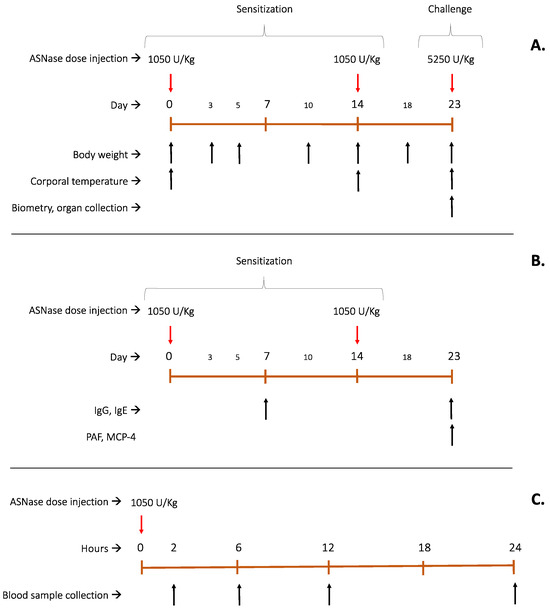 Flowchart of experimental design for in vivo studies. (A): Multi-organs toxicological effects of animal exposure to multiple doses of ASNase (WT and mutants) for 23 days of experimentation, with continuous weight control on days 0, 3, 5, 10, 14, 18 and 23. Temperature was measured for two hours after each ASNase injection on days 0, 14 and 23. On day 23, a blood sample was collected for biometry analysis, and organs were collected and treated with haematoxylin and eosin (H&E stain). (B): Antigenic and Allergenic potential evaluation of each proteoform after two sensitisation doses by plasmatic quantification of IgG and IgE (days 7 and 23) and PAF and MCP-4 (day 23). (C): Pharmacokinetics profile of ASNase (WT and mutants) for 24 h, with enzyme activity detection at 2, 6, 12 and 24 h after injection. Asparaginase activity was measured by the oxine method in plasma. Red arrows indicate the days of injection of ASNase; Black arrows show the days of blood collection for the analysis indicated in the figure.