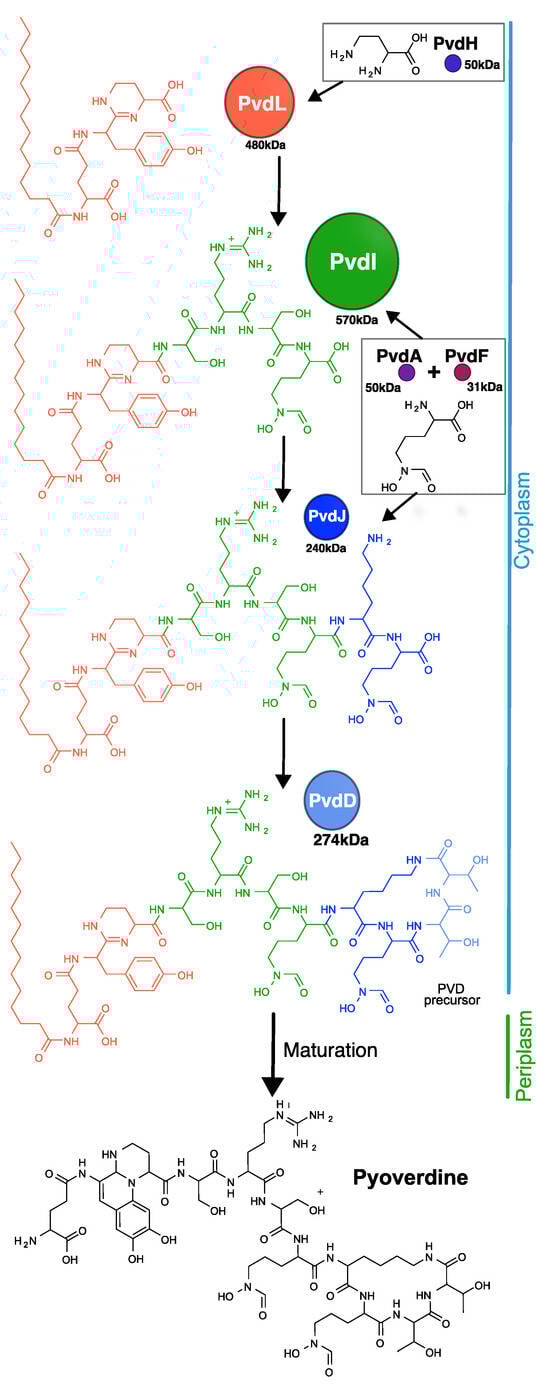 Assembly of the pyoverdine molecule. The cytoplasmic pyoverdine precursor is assembled by four NRPSs (PvdL, PvdI, PvdJ, and PvdD) with three smaller enzymes (PvdH, PvdA, and PvdF) providing modified amino acids. Every NRPS adds blocks (like amino acids) in the peptide backbone. In the very first step, PvdL introduces myristic acid, which is removed once the pyoverdine precursor is transported into the periplasm and before it undergoes maturation of the chromophore.