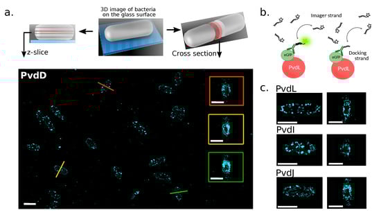 (a) Representative z-axis slice projections of 3D localizations of labeled PvdD in fixed bacterial cells on a glass coverslip (scale bar = 2 m). Some cross-sections of bacteria are presented in the colored boxes (scale bar = 1 m. (b) DNA-PAINT principle: DNA-PAINT uses DNA’s specific interactions for super-resolution imaging. Fluorescently tagged DNA strands (imagers) briefly bind to target molecules tagged with complementary DNA (docking strand) to create the necessary ‘blinking’ for precise localization and high-resolution image reconstruction in single-molecule localization microscopy. (c) z-projections and cross-sections obtained for PvdL, PvdI, and PvdJ in fixed P. aeruginosa cells (scale bars = 1 m).