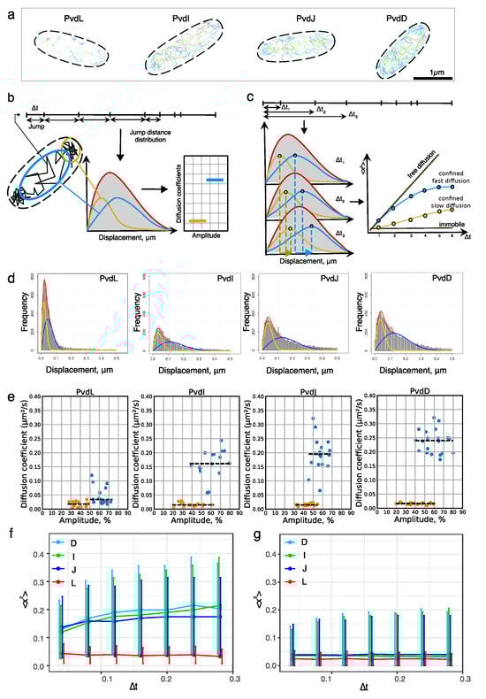 Even when bound to the inner membrane, the diffusion of PvdL is slow. This was confirmed by the MSD curves corresponding to the slow component, which did not increase with increasing t (Figure 3g). This shows that a fraction of PvdL appeared immobile in the membrane when tracked with a pointing precision of about . In line with the fact that the jump distribution could almost be considered a single population, the MSD of the faster component also remained constant over the t range (Figure 3f). On the contrary, PvdI, J, and D showed an MSD compatible with confined diffusion, as expected from the dimension of the cytoplasmic compartment in which these proteins can diffuse [33]. Interestingly and like PvdL, their slow component appeared to be immobile. Despite the limitations of the 2D projections, the locations of the immobile tracks suggest that slow diffusion regimes mostly occur near the inner membrane (see Supplementary Figure S1).