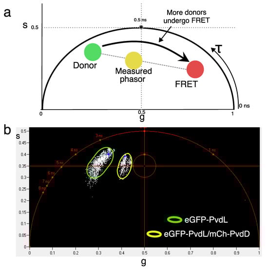 (a) Phasor approach principle. On a phasor plot, each phasor point is obtained by a transformation of the fluorescence decay of one FLIM pixel. The phasor coordinates are defined by real (g) and imaginary (s) parts of the Fourier transform. The position of the donor in the phasor plot will depend on its lifetime (green filled circle). When all the donor molecules undergo FRET with a high transfer efficiency, the phasor is shifted in the direction of lower lifetimes (red filled circle). In the case of a lower FRET efficiency, the phasor will stand on the line joining the two previously described positions (yellow filled circle). (b) Phasor plot. A clear shift between phasors of the donor (eGFP-PvdL, green oval) and the donor acceptor pair (eGFP-Pvdl/mCh-PvdD, yellow oval) can be seen, showing a protein–protein interaction between PvdL and PvdD.