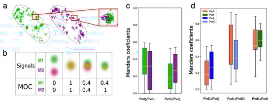 - Manders, E.M.; Verbeek, F.J.; Aten, J.A. Measurement of co-localization of objects in dual-colour confocal images. J. Microsc. 1993, 169, 375–382. [Google Scholar] [CrossRef] [PubMed]