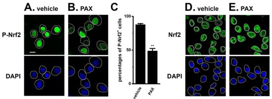 Effects of the PAX treatment on the nuclear translocation of P-Nrf2 in isolated cells from the LNCaP spheroid model. (A,B): Confocal fluorescent images of Alexa Fluor 488-labeled P-Nrf2 (green, upper panels) in vehicle- (A) and PAX (B)-treated LNCaP cells. Nuclear morphologies were assessed using DAPI staining (blue, lower panels). Dashed lines show nuclear and cell boundaries. The white bar in (A) is calibration (10 μm). (C): Summarized results of the percentage of P-Nrf2-positive cells in LNCaP cells (n = 6, more than 30 cells for each data point). **: p < 0.01 vs. the vehicle control. (D,E): Confocal fluorescent images of Alexa Fluor 488-labeled Nrf2 (green, upper panels) in vehicle- (D) and PAX- (E) treated LNCaP cells. Nuclear morphologies were assessed using DAPI staining (blue, lower panels).