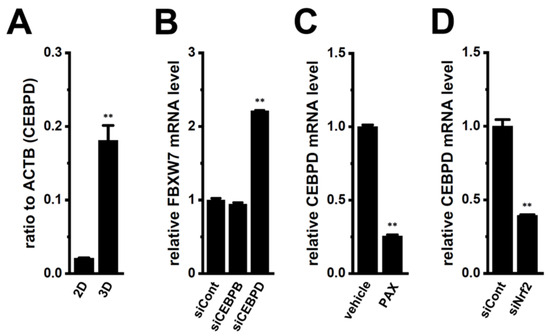 Comparison of expression levels of CEBPD transcripts between 2D monolayers and 3D spheroids of LNCaP cells, effects of the siRNA-mediated inhibition of CEBPB and CEBPD on expression levels of FBXW7 transcripts in the LNCaP spheroid model, and effects of the pharmacological inhibition of KCa1.1 with 10 μM PAX for 12 h and the siRNA-mediated inhibition of Nrf2 on expression levels of CEBPD transcripts in the LNCaP spheroid model. (A): Real-time PCR of CEBPD in 2D monolayers and 3D spheroids of LNCaP cells (n = 4). Expression levels are shown as a ratio to ACTB. (B): Real-time PCR of FBXW7 in the LNCaP spheroid models transfected with negative control siRNA (siCont), CEBPB siRNA (siCEBPB), and CEBPD siRNA (siCEBPD). After normalization to ACTB mRNA expression levels, FBXW7 mRNA expression levels in the siCont-transfected group were expressed as 1.0. (C): Real-time PCR of CEBPD in the vehicle- and PAX (10 μM)-treated LNCaP spheroid models for 12 h (n = 4). (D): Real-time PCR of CEBPD in the control siRNA (siCont)- and Nrf2 siRNA (siNrf2)-transfected LNCaP spheroid models (n = 4). After normalization to ACTB mRNA expression levels, CEBPD mRNA expression levels in the vehicle control or siCont group were expressed as 1.0. **: p < 0.01 vs. the 2D (A), siCont (B,D), and vehicle control (C) groups.