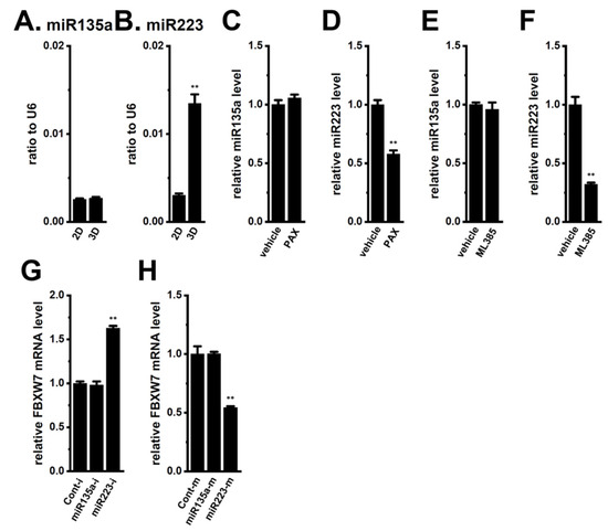 Comparison of expression levels of miR135a and miR223 between 2D monolayers and 3D spheroids of LNCaP cells; the effects of the pharmacological inhibition of KCa1.1 and Nrf2 with 10 μM PAX and 10 μM ML385, respectively, for 12 h on expression levels of miR135a and miR223; and the effects of miR223 modulators on FBXW7 mRNA expression levels in the LNCaP spheroid model. (A,B): Real-time PCR of miR135a and miR223 in 2D monolayers and 3D spheroids of LNCaP cells (n = 4). Expression levels are shown as a ratio to U6. (C,D): Real-time PCR of miR135a and miR223 in the vehicle- and PAX (10 μM)-treated LNCaP spheroid models for 12 h (n = 4). (E,F): Real-time PCR of miR135a and miR223 in the vehicle- and ML385 (10 μM)-treated LNCaP spheroid models for 12 h (n = 4). After normalization to ACTB mRNA expression levels, miR135a and miR223 expression levels in the vehicle controls were expressed as 1.0. (G,H): Real-time PCR of FBXW7 in the miRNA inhibitor negative control (Cont-i)-, miR-135a-5p miRNA inhibitor (miR-135a-i)-, miR-223-5p miRNA inhibitor (miR-223-i)-, miRNA mimic negative control (Cont-m)-, miR-135a miRNA mimic (miR-135a-m)-, and miR-223 miRNA mimic (miR-223-m)-transfected LNCaP spheroid models (n = 4). After normalization to ACTB mRNA expression levels, FBXW7 mRNA expression levels in negative controls (Cont-i and Cont-m) were expressed as 1.0. **: p < 0.01 vs. the 2D (B), vehicle control (D,F), Cont-i (G), and Cont-m (H) groups.