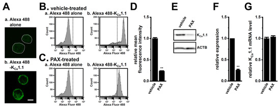 Based on the results obtained thus far, we hypothesized that the inhibition of KCa1.1 promotes the FBXW7-mediated protein degradation of KCa1.1 in the LNCaP spheroid model, increasing both its protein expression in the plasma membrane and its activity. To assess the protein expression level of KCa1.1 in the plasma membrane, we performed immunocytochemical staining with an Alexa Fluor 488-conjugated anti-KCa1.1 antibody, which distinguishes the extracellular region of KCa1.1 in fixed, non-permeabilized cells of the LNCaP spheroid model. We successfully visualized KCa1.1 in the plasma membrane of isolated cells from the LNCaP spheroid model using confocal imaging (Figure 6A). We then examined the effects of the treatment with PAX for 48 h on the protein expression levels of KCa1.1 in the plasma membrane by flow cytometric (Figure 6B–D) and Western blotting (Figure 6E,F) analyses. The obtained results showed that the protein expression levels of KCa1.1 were significantly decreased by the treatment with PAX (p < 0.01, n = 5 and 4 in Figure 4D,F, respectively). No significant change was noted in the expression level of KCa1.1 transcripts using the treatment with PAX (n = 4 for each, p > 0.05) (Figure 6G). These results suggest that KCa1.1 activity was reduced by long-term KCa1.1 inhibition mediating FBXW7 in the LNCaP spheroid model.