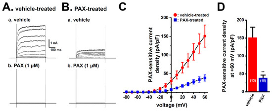 Effects of the treatment with 10 μM PAX for 48 h on PAX-sensitive outward K+ currents in isolated cells from the LNCaP spheroid model. (A,B): Currents were elicited by a 500 ms depolarizing voltage step between −80 and +60 mV from a holding potential (−60 mV), with 10 mV increments in LNCaP cells treated with vehicle (A(a)) and 10 μM PAX (B(a)). Before current measurements, isolated cells were incubated with normal culture media in which PAX was excluded for more than 4 h. The application of 1 μM PAX markedly reduced outward K+ currents in LNCaP cells (A(b),B(b)). (C): Current density–voltage relationship for PAX-sensitive peak current density in vehicle-treated (●) and PAX-treated (■) LNCaP cells. (D): Summarized results on PAX-sensitive current density at +60 mV in vehicle- and PAX-treated LNCaP cells. Numbers used for experiments are shown in parentheses. **: p < 0.01 vs. the vehicle-treated group.