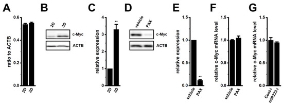 Effects of the treatment with PAX on c-Myc expression in the LNCaP spheroid model. (A): Real-time PCR of c-Myc in 2D monolayers and 3D spheroids of LNCaP cells. Expression levels are shown as a ratio to ACTB (n = 4). (B): Protein expression of c-Myc in protein lysates of 2D monolayers and 3D spheroids of LNCaP cells. Blots were probed with anti-c-Myc (approx. 50 kDa) and anti-ACTB (approx. 45 kDa) antibodies. (C): Summarized results were obtained as the optical densities of c-Myc from (B). After the normalization of the optical densities of protein band signals with those of the ACTB signal, the optical density in 2D was expressed as 1.0 (n = 4). (D): Protein expression of c-Myc in protein lysates of the LNCaP spheroid model treated with vehicle and 10 μM PAX for 48 h. Blots were probed with anti-c-Myc and anti-ACTB antibodies. (E): Summarized results were obtained as the optical densities of c-Myc from (D). Optical density in the vehicle control (vehicle) was expressed as 1.0 (n = 4). (F): Real-time PCR of c-Myc in LNCaP spheroid models treated with vehicle and 10 μM PAX for 12 h. After normalization to ACTB mRNA expression levels, c-Myc mRNA expression levels in the vehicle control (vehicle) were expressed as 1.0 (n = 4). (G): Real-time PCR of c-Myc in the miRNA inhibitor negative control (Cont-i)- and miR-223-5p miRNA inhibitor (miR-223-i)-transfected LNCaP spheroid models. After normalization to ACTB mRNA expression levels, c-Myc mRNA expression levels in Cont-i were expressed as 1.0 (n = 4). **: p < 0.01 vs. the 2D (C) and vehicle control (E) groups.