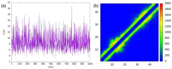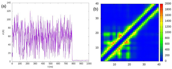 (a) Minimum distance between two A40 molecules in the simulation of a solution at 0.5 mM concentration. (b) Intramolecular contacts.