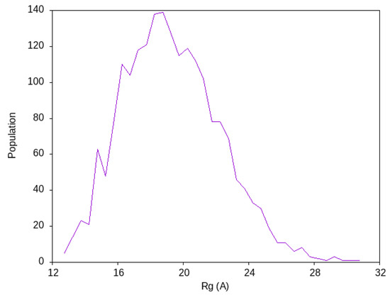 The size of the conformational ensemble of ACTR had been estimated from SAXS measurements to have a radius of gyration Å. The ensemble obtained by Best et al. [22] in their explicit solvent molecular dynamics simulations with TIP4P/2005 water for ACTR showed a distribution of the radius of gyration of the protein, whose maximum is around 14 Å. We show in Figure 4 the distribution of found with our simulation based on PACSAB, which shows its maximum around 19 Å, closer to the experimental observations. This distribution coincides with the distribution we obtained in our previous work, showing that the slight change that we introduced in the PACSAB force field parameterization had no effect on the structural ensemble of this disordered protein.