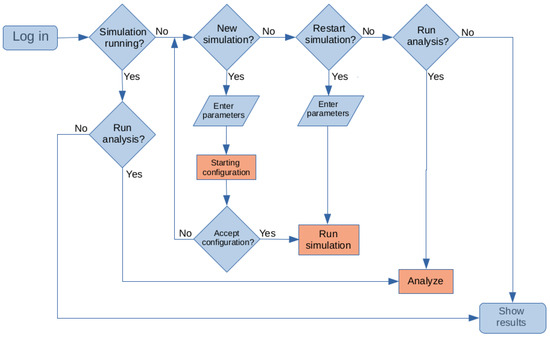 The structure of the web tool is illustrated in the flowchart of Figure 6. The red rectangles in the flowchart mark actions performed by the compute server: prepare the PACSAB model structure of the system, analyze a simulation, or run a simulation. In the case of no simulation running, the user’s home page also shows a section where the user can submit a new simulation through a web form; the user has to upload the protein structure file with the coordinates of the protein in the GROMACS [5] format (.gro file) (see information in https://www.gromacs.org for more details), which is the format that the simulation machinery of the compute server is able to understand (instructions on how to generate the .gro file from an RCSB Protein Data Bank structure (https://www.rcsb.org/ (accessed on 23 May 2024)) are given in the web page). The user is also asked for the frame-to-frame time , the size of the simulation box (determined by the concentration of the solution to simulate), and the offset of the copy of the protein (as the system simulated consists of two copies of the protein in a box with periodic boundary conditions). The user can choose to use structure-based potentials, which is useful in the simulation of stable proteins (this would not make sense in the case of disordered proteins as a native structure of the protein is not defined in this case), or an unfolding force field parametrization with very hydrophilic values of the force field and very low hydrogen bonding energy, very useful for generating random coil structures to be used as starting conformations for the simulation of disordered proteins, whose structure in aqueous solution is not well defined. The user can also modify the parameters of the PACSAB force field, whose values are set as default in the form.