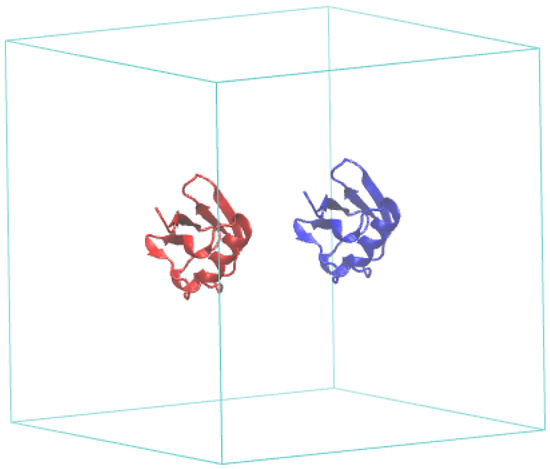 Once the protein coordinate file has been uploaded, the server creates a copy of the molecule, and the user is asked to download the PDB coordinates file of the whole simulation box to confirm that the relative position of the two molecules is correct, as shown in Figure 7. The user then decides if the starting configuration is good for beginning the simulation or if the setup has to be discarded.