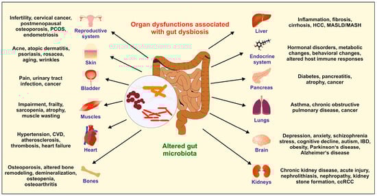 Organ dysfunction as a consequence of dysbiosis. The balance of the physiological microbiota community (eubiosis) in the gut is crucial to ensure an individual’s health. Factors such as an unhealthy diet, excessive fasting, alcohol consumption, smoking, physical or psychological stress, chronic inflammation, and the overuse of antibiotics can lead to dysbiosis, which can negatively impact the health of organs. Diseases associated with abnormalities and imbalances in the gut microbiota can vary greatly and affect all organs. The abbreviations used are as follows: ccRCC, clear cell renal cell carcinoma; CVD, cardiovascular disease; HCC, hepatocellular carcinoma; IBD, inflammatory bowel disease; MASH, metabolic-associated steatohepatitis; MASLD, metabolic dysfunction-associated steatotic liver disease; PCOS, polycystic ovary syndrome. For more information on the impact of the gut microbiota and its role in health and disease, please refer to [14].