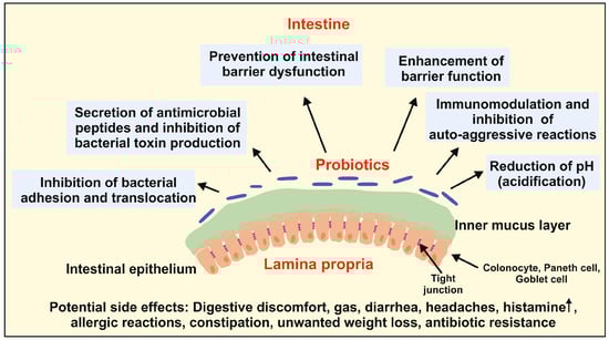 Beneficial effects of probiotics on the function and homeostasis of the intestinal barrier. Probiotics impact the intestinal barrier by preventing intestinal barrier dysfunction through enhancing the expression of tight junction proteins and inhibition of bacterial adhesion and translocation. Moreover, probiotics lower the luminal pH value through the secretion of anti-microbial active peptides, acetic and lactic acids, which inhibits the growth of non-commensal pathogens and the production of their bacterial toxins. They further modulate the host’s immune system, thereby inhibiting auto-aggressive reactions. However, probiotics can have the depicted side effects such as digestive discomfort, headaches, constipation, unwanted weight loss, and others. Please note that the image does not show the full structure of the gastrointestinal wall including its mucosa, submucosa, muscularis, and serosa.