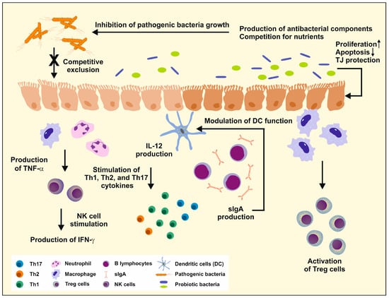 Probiotics are effective in strengthening the host’s immune system. They have various effects on an individual’s health, including inhibiting the growth of pathogenic bacteria through the production of antibacterial components and competition for nutrients. Probiotics also compete for mucosal adhesion sites and stimulate the expression of cytokines that affect cell proliferation and apoptosis. Additionally, they promote the production of tight junction (TJ) proteins and stimulate or modulate immune cell function in natural killer (NK) cells and dendritic cells (DC). The increased production of secretory IgA (sIgA) helps protect the intestinal epithelium from enteric pathogens and their toxins. More information on the impact of probiotics on immunity and their mechanism of action on immune cells can be found in other publications [62,63]. Please note that the gastrointestinal wall is only roughly depicted and does not show its fine structure, which includes the mucosa, submucosa, muscularis, and serosa.