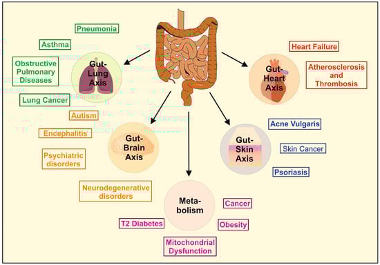 Moreover, the alteration of beneficial gut microbiota can provoke gastrointestinal diseases such as irritable bowel syndrome, inflammatory bowel disease (IBD), celiac disease, colorectal cancer, and many other diseases. Importantly, an imbalance of the gut microbial communities and their metabolites has also been closely related to the dysfunction or illnesses of other organs (Figure 2).