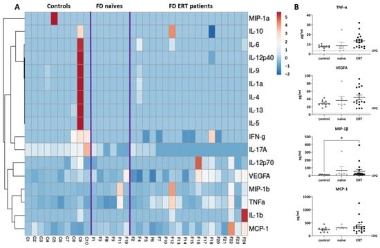 Plasma biomarkers related to inflammatory response were assessed by Luminex-multiplex-ELISA. (A) Heat map of assessed biomarkers levels representing Z-score of cytokine concentrations in each sub-cohort, using a color grade scale from dark blue (minimum) to dark red (maximum). Purple lines represent separation between groups. Correlation groups for each biomarker are indicated. (B) Dot plots indicating plasmatic concentrations (pg/mL) of the cytokines selected for validation (MIP-1β, MCP-1, VEGFA, and TNF-α) in each subject of the analyzed cohorts (FD non-treated patients: naïve; FD patients treated with ERT: ERT and healthy subjects: controls). Horizontal dotted line indicates assay lower limit of quantification (LOQ). Statistical significance was assessed with one-way ANOVA non-parametric test (Kruskal–Wallis multiple comparisons, * p < 0.05).