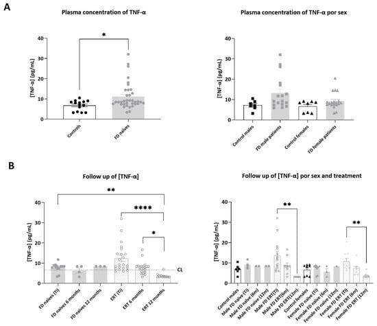 Representation of plasmatic concentration of TNF-α in the analyzed cohorts. (A) Left graph shows histograms representing mean concentration (mean ± SEM) of TNF-α (pg/mL) in FD patients (treated or not with ERT) versus healthy controls. The right diagram represents concentrations of the biomarkers in patients and controls divided by sex. (B) Histograms in the left panel represent the mean concentration (mean ± SEM) of TNF-α in FD naïve and treated patients at different time points (study onset (Ti), 6 and 12 months after Ti). Dotted line CL represents the mean plasmatic concentration in control subjects. In the right panel, evolution of mean concentration of the biomarker in the treatment groups is discriminated by sex. Statistical significance was assessed with one-way ANOVA non-parametric test (Mann–Whitney or Kruskal–Wallis comparisons, * p < 0.05, ** p < 0.01, **** p < 0.0001).