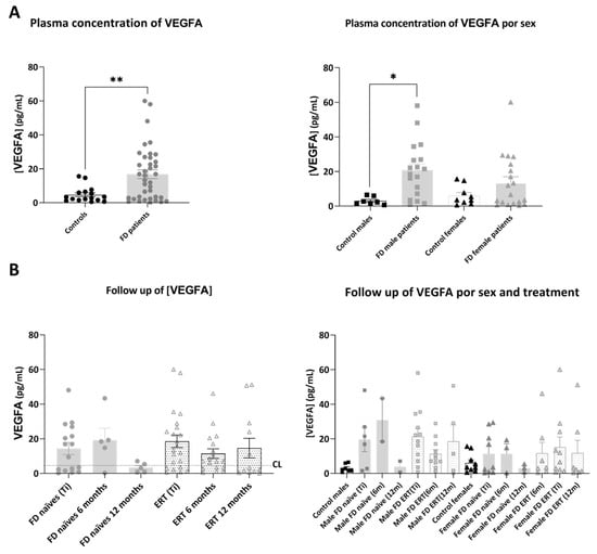 Representation of plasmatic concentration of VEGFA in the analyzed cohorts. (A) Left graph shows histograms representing mean concentration (mean ± SEM) of VEGFA (pg/mL) in FD patients (treated or not with ERT) versus healthy controls. The right diagram represents concentrations of the biomarkers in patients and controls divided by sex. (B) Histograms in the left panel represent the mean concentration (mean ± SEM) of VEGFA in FD naïve and treated patients at different time points (study onset (Ti), 6 and 12 months after Ti). Dotted line CL represents the mean plasmatic concentration in control subjects. In the right panel, evolution of mean concentration of the biomarker in the treatment groups is discriminated by sex. Statistical significance was assessed with one-way ANOVA non-parametric test (Mann–Whitney or Kruskal–Wallis comparisons, * p < 0.05, ** p < 0.01).
